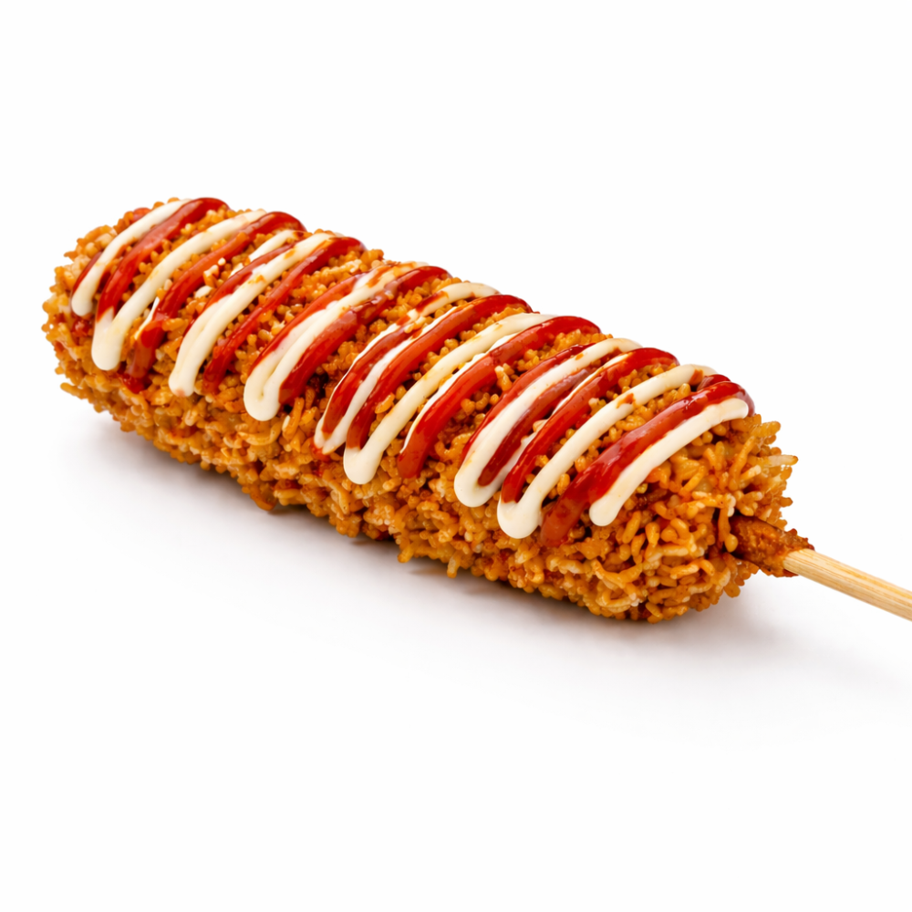 Легенда корейского стрит-фуда. Сочная куриная сосиска, тянущийся сыр на палочке в хрустящей кукурузной панировке из лапши в соусах