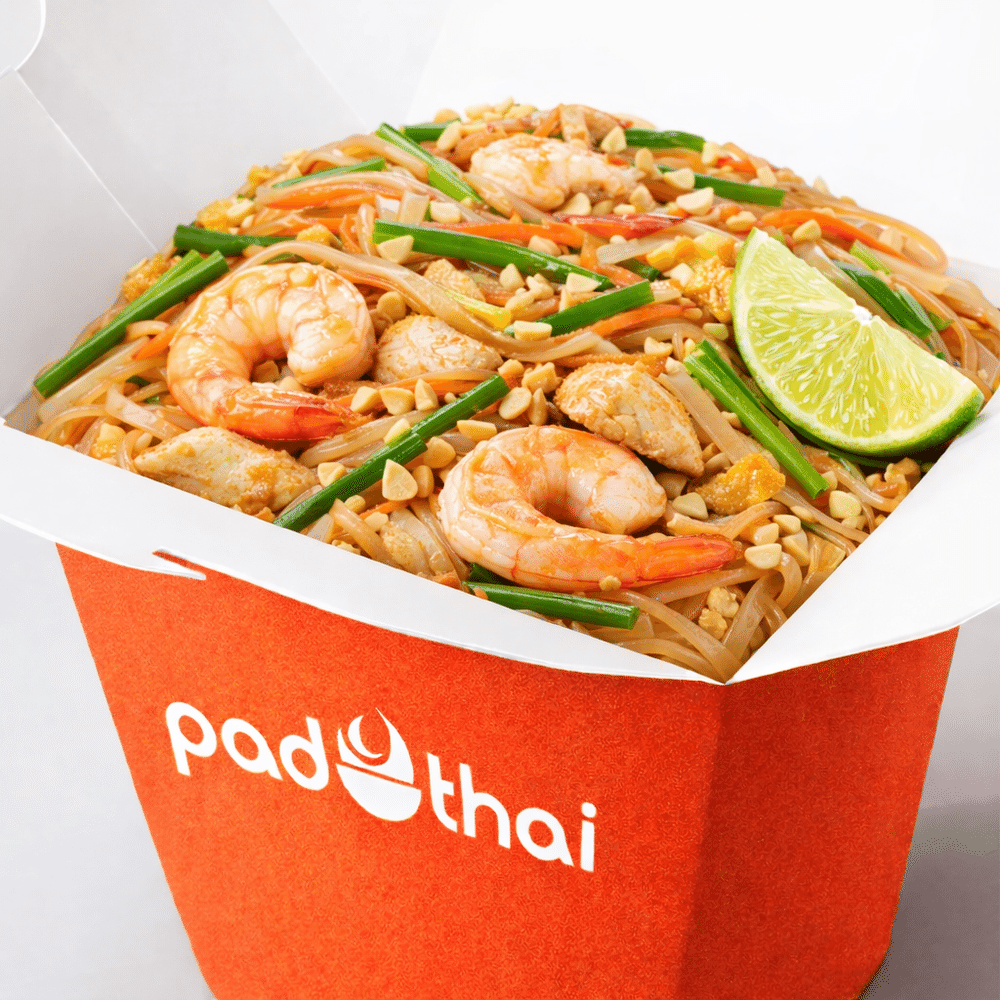 Лапша рисовая, лук зеленый, морковь, креветки, курица, тофу, арахис, лайм, яйцо обжаренное, соус Пад Тай