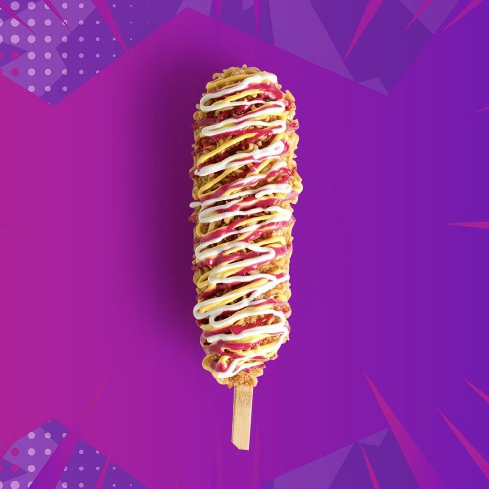 Легенда корейского стрит-фуда. Сочная куриная сосиска, тянущийся сыр на палочке в хрустящей кукурузной панировке из лапши в соусах