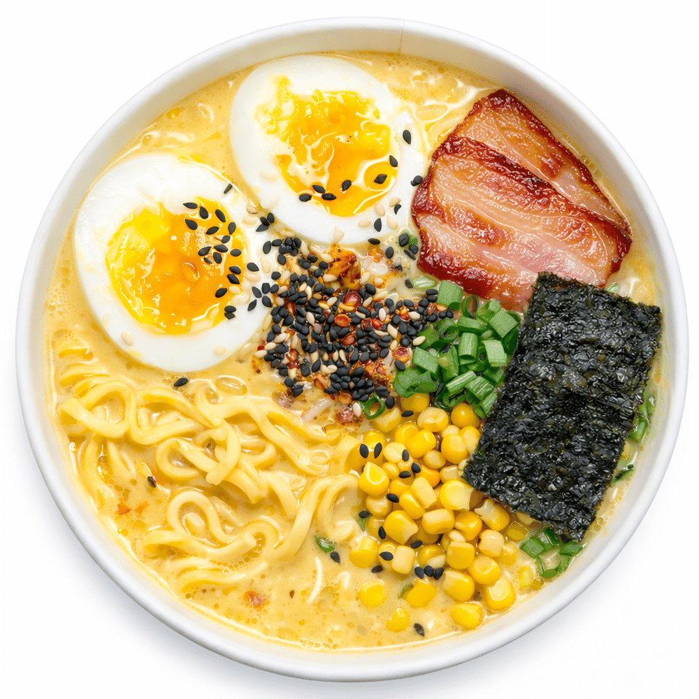 Аппетитное Корейское блюдо, сырный бульон сырный рамен ,лапша яичная ,кукуруза сладкая , лук зеленый, опалённый бекон, яйцо, нори