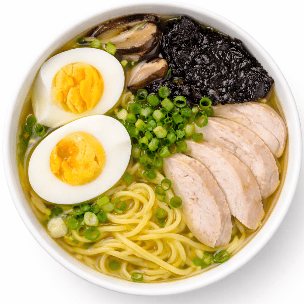Классическое блюдо японской кухни, рамен бульон, курица, лапша яичная , лук зеленый, шиитаке, нори, яйцо