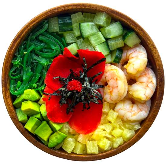 Рис поке, лосось, кукуруза, огурец, авокадо, чука салат, имбирь, нори, тобико, кунжут, соус айоли, соус трюфельный