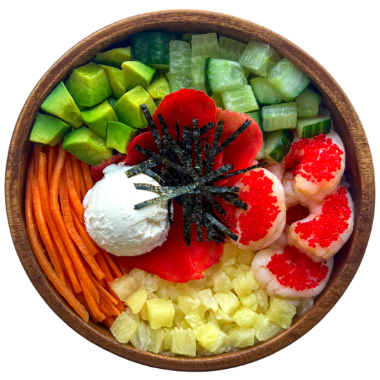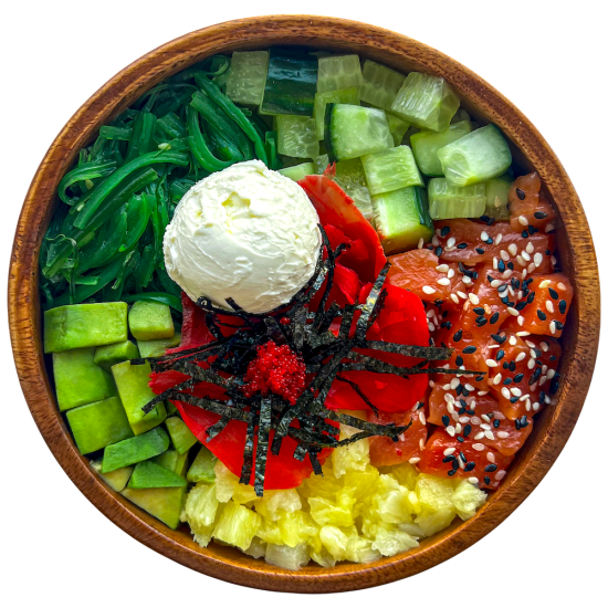 Рис поке, лосось, кукуруза, огурец, авокадо, чука салат, имбирь, нори, тобико, кунжут, соус айоли, соус трюфельный