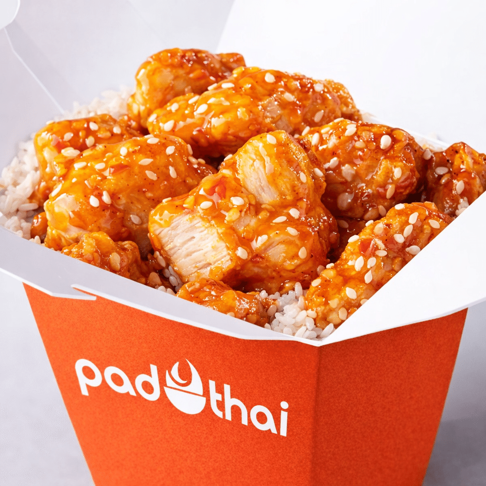 Наше фирменное блюдо! Курочка вок в апельсиновом кляре на подушке из риса, кунжут.