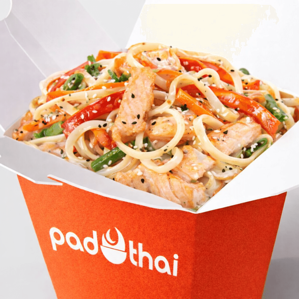 Лапша удон, овощи ( морковь, стручковая фасоль, перец, капуста б/к ) лосось, соус сливочный, обжаренное яйцо, кунжут.