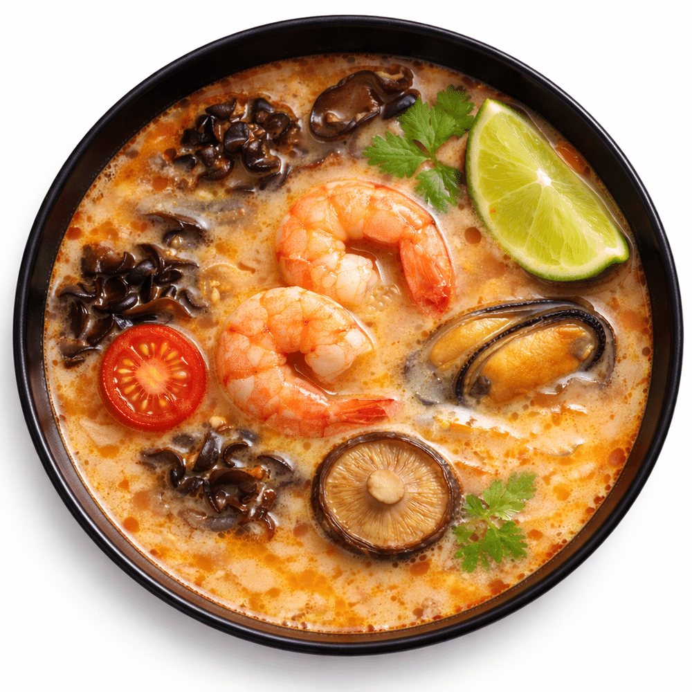 Традиционный тайский суп, креветки королевские, мидии , томат черри, грибы муэр, шитаке, лайм