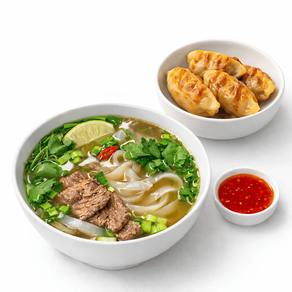 Горячий Фо Бо с насыщенным бульоном и нежной говядиной + золотистые гёдза с курицей и пикантным соусом. Идеально, когда хочется сытного и согревающего.