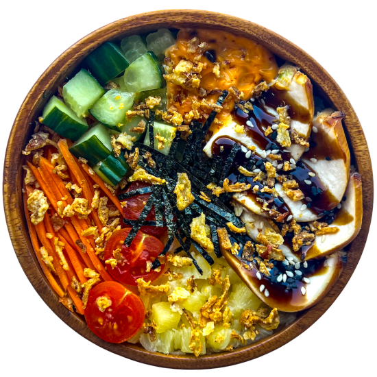Рис поке, тунец, салат чука, огурец, имбирь, черри томат, нори, сыр творожный, кунжут, посыпка бонито, соус айоли, соус поке