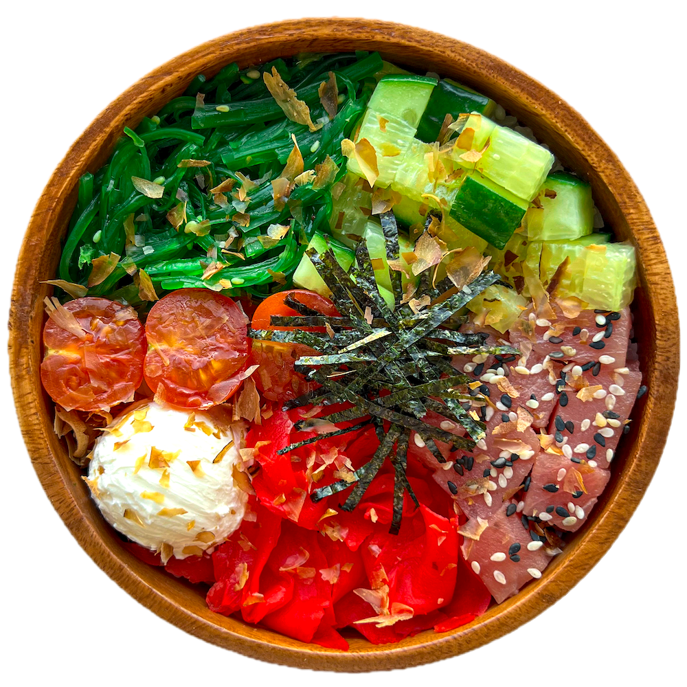 Рис поке, тунец, салат чука, огурец, имбирь, черри томат, нори, сыр творожный, кунжут, посыпка жареный лук, соус айоли, соус поке