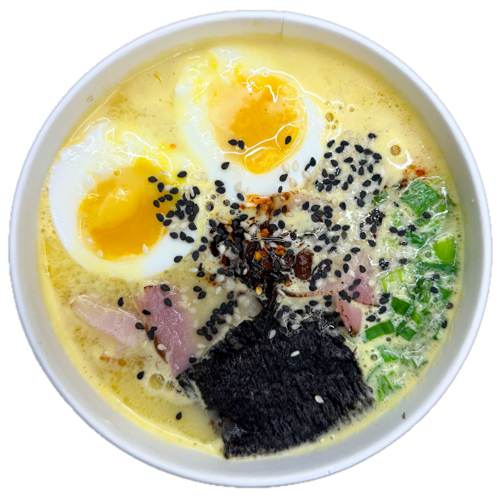 Аппетитное Корейское блюдо, сырный бульон сырный рамен ,лапша яичная ,кукуруза сладкая , лук зеленый, опалённый бекон, яйцо, нори